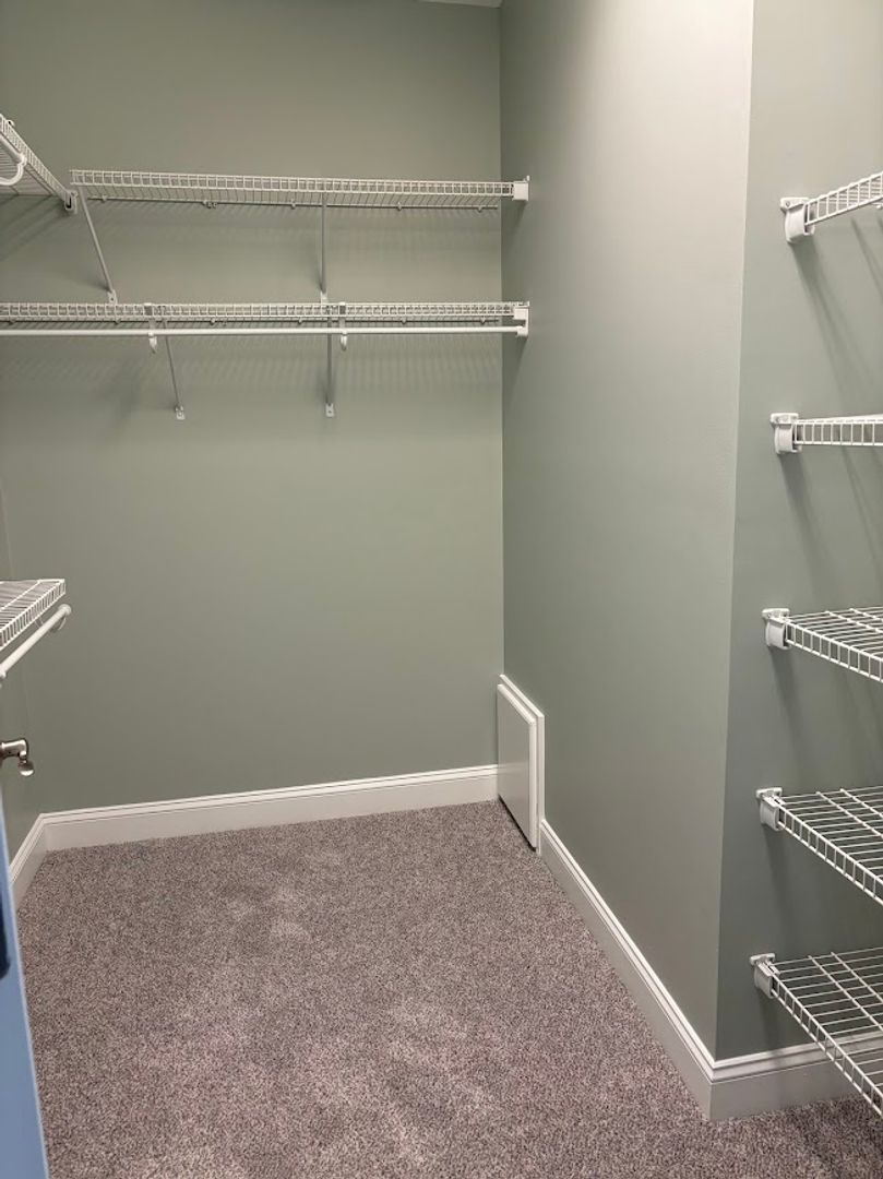The washer and dryer hookups are in a separate laundry room, with a door. The room includes some built in cabinets for extra storage.